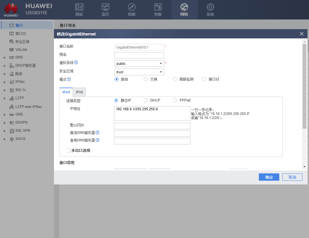 选择内网接口点击编辑,安全区域选择trust,连接选择静态IP,填写192.168.0.1/255.255.255.0,其余信息均可留空